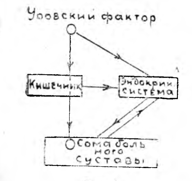Статистический анализ эндемии не дает оснований считать б. Бека тиреогенным артритом, действительно: коэффициент корреляции между артритом и увеличением щ. ж., вычисленный по Пирсону (см. диаг. 1): г = 0,38 ±0,007, значительно менее 0,5, что указывает на отсутствие связи этих двух явлений; тоже дает коэффициент ассоциации по Юлю: u = 0,52, т. е. показатель Юля, близкий к 0,5 безразличен.