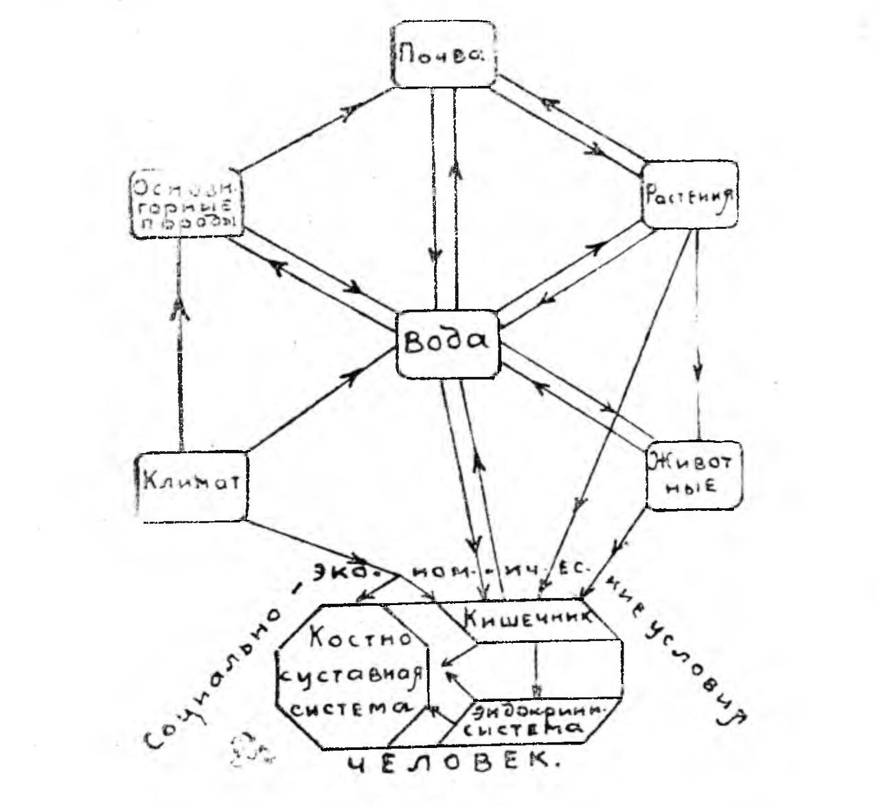 Исследование Уровекой эндемии так же, как и борьба с нею, должны вестись широко-комплексным методом, с охватом, соответствующим предлагаемой „схеме взаимовлияний".