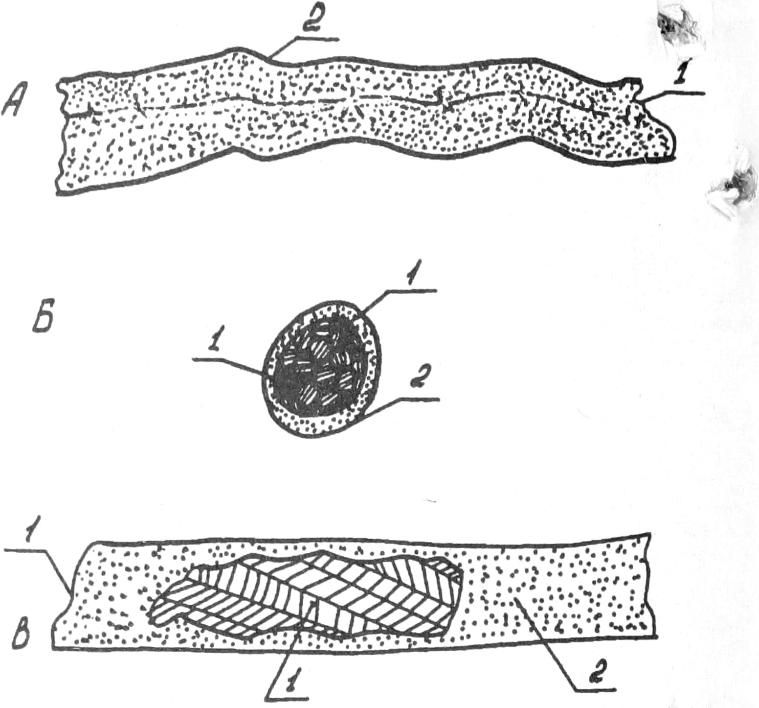 Целью нашей работы являлось исключение распиливающего эффекта хирургической нити при соединении тканей. Для этого нами предложена композиционная нить (рис. А, Б, В), состоящая из двух частей: прочная центральная основа (1), которая покрыта тонкой наружной оболочкой (2). Покрытие (2) имеет гладкую ровную поверхность и выполнено из биологически инертного полимера. Прочность композиционной нити придает неэластичная срединная часть (1) из капрона, лавсана, нейлона и пр., которая придает стабильность хирургическому узлу, исключая его расслабление и снижение степени адаптации тканей. Полифиламентность основы (1) обеспечивает надежность нити. Гладкая полимерная оболочка (2), покрывающая срединную часть нити (1), не вызывает разрушения стенок раневого канала, что ослабляет местную воспалительную послеоперационную реакцию.