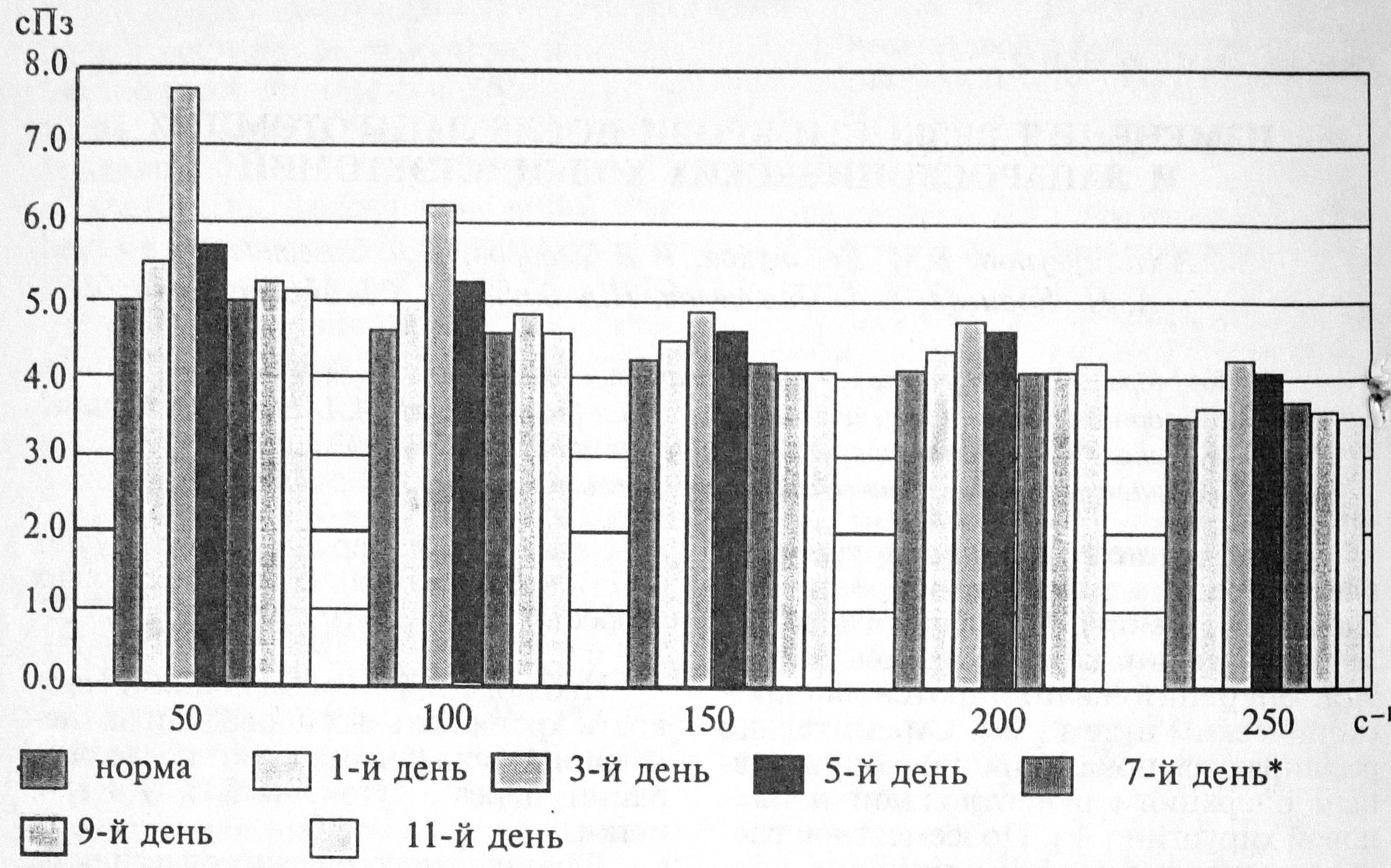 Рис. 1. Изменения вязкости крови (ось абсцисс) при различной скорости сдвига (ось ординат) после лапаротомной холецистэктомии. * Недостоверно.