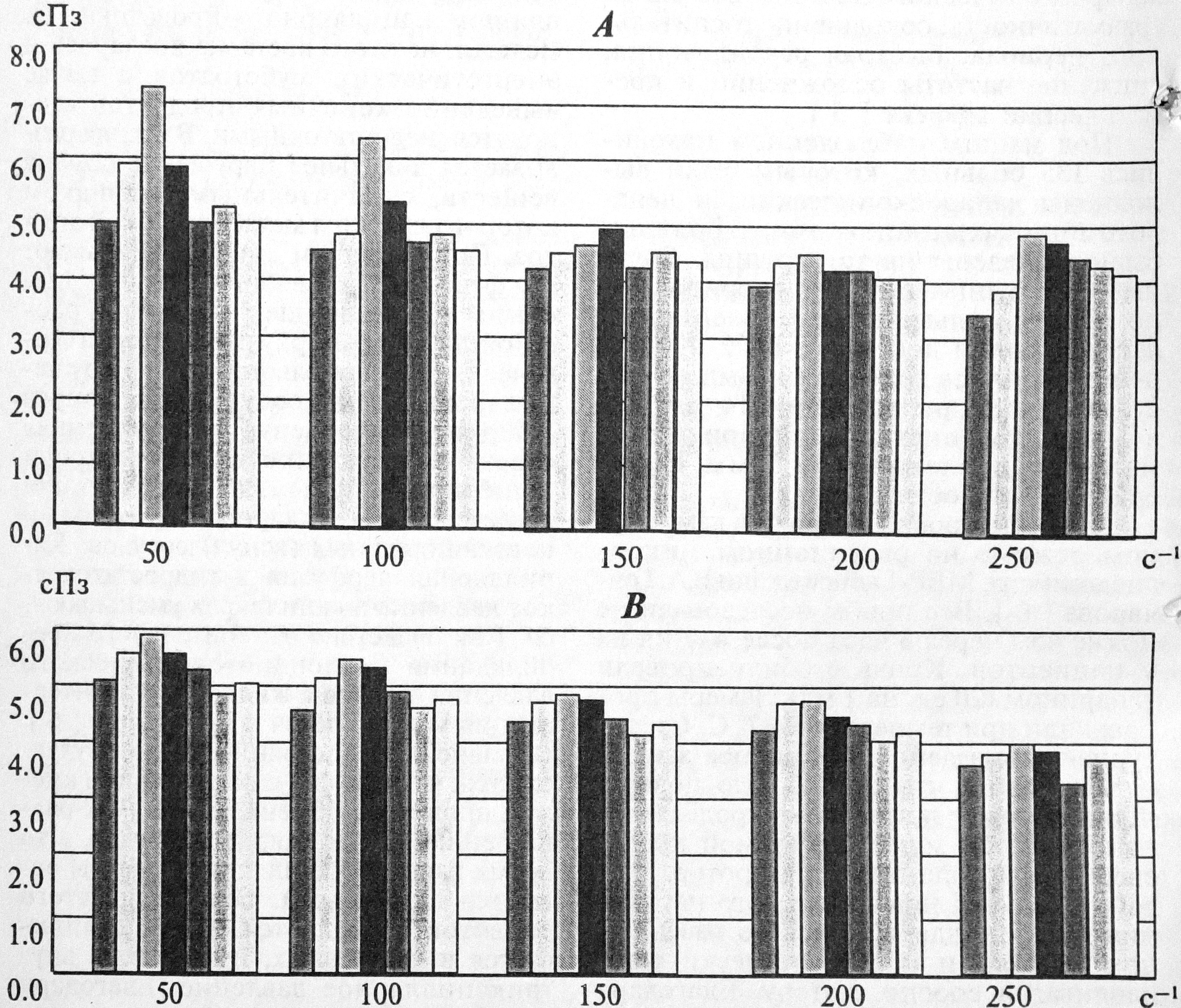 Рис. 2. Изменения вязкости крови (ось абсцисс) при различной скорости сдвига (ось ординат) после эндоскопической холецистэктомии на фоне Р=4 мм Hg (А) и Р=14 мм Hg (В). Обозначения те же, что и на рис. 1.