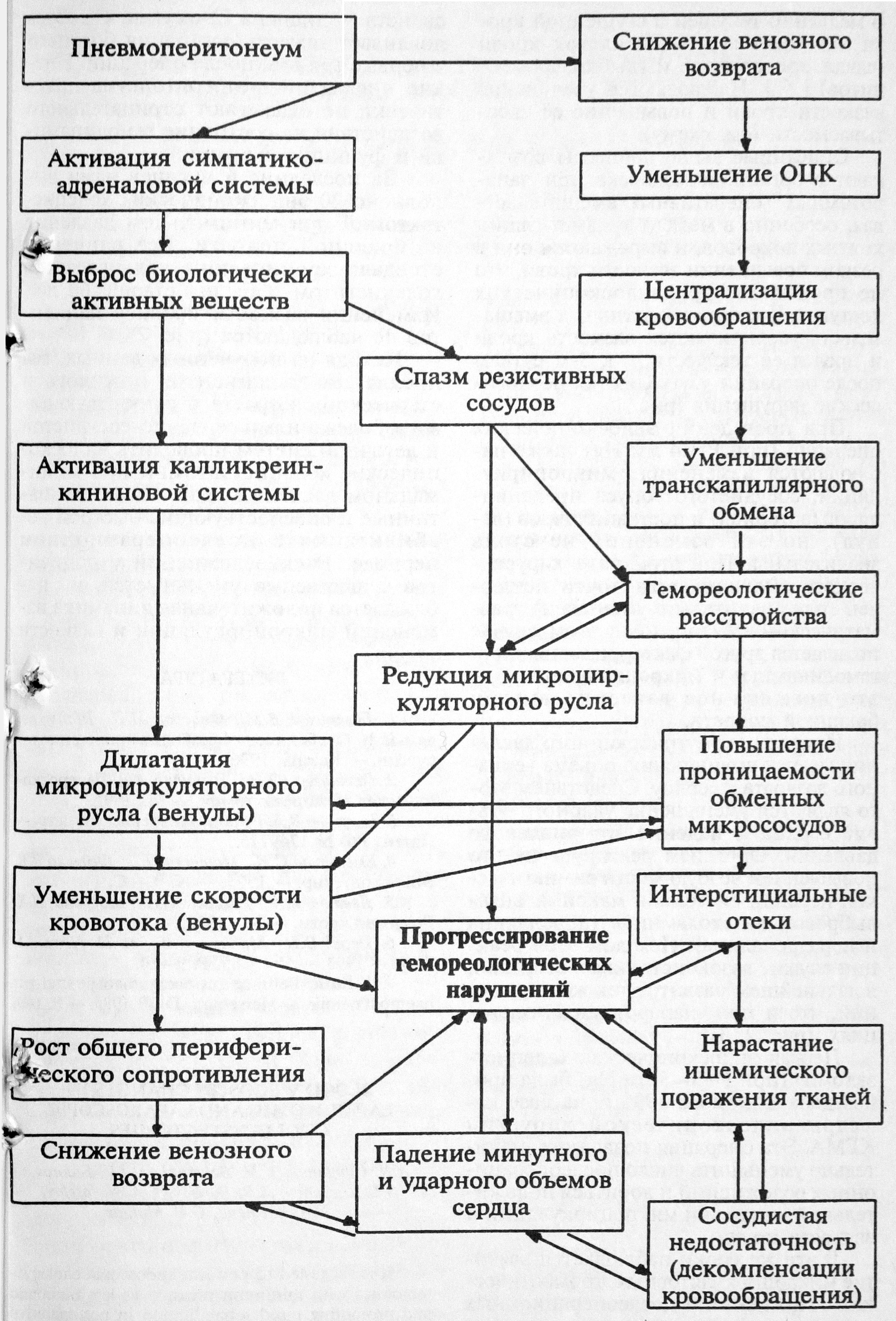 Изменение внутрибрюшного давления ведет к уменьшению объема венозного возврата к сердцу. Следствием этого являются уменьшение ударного объема сердца и падение артериального давления. Организм реагирует на это повышением возбудимости симпатической нервной системы и максимальным выбросом катехоламинов (адреналина и норадреналина). Исходом этой реакции служит вазоконстрикция сосудов и в дальнейшем развитие тех же нарушений, что и при лапаротомных операциях (рис. 2, 3).