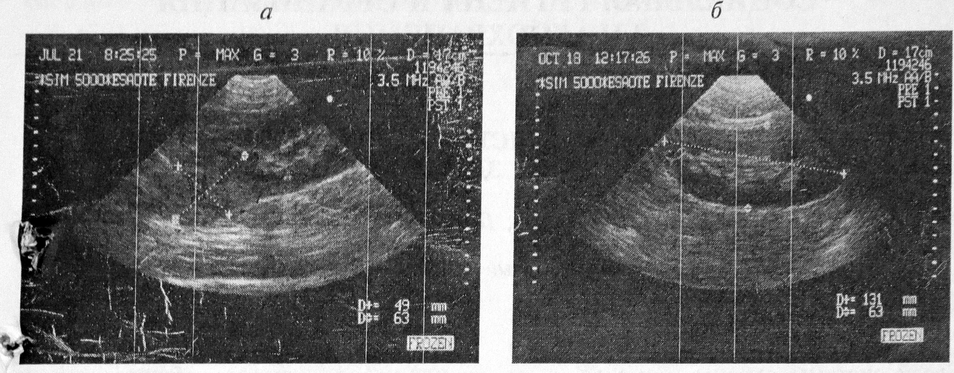 На эхограмме через 4 года: компенсаторная гипертрофия почки сохраняется. Почка приняла обычную форму с незначительной деформацией контура нижнего полюса (рис. 1 б). Признаков рецидива нет.
