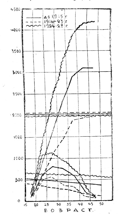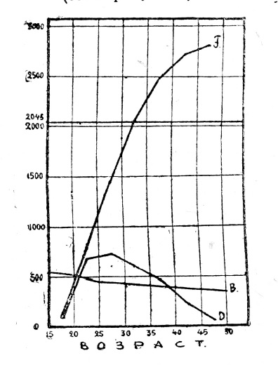 Ординаты кривой В означают число женщин в возрасте 15—50 лет, найденные по таблице доживаемости; ординаты кривой Д—числа детей, рожденных каждой возрастной группой этих женщин, вычисленные по цифрам плодовитости отдельных возрастов, но за вычетом мертворожденных, ординаты кривой F—сумму этих детей от 15—50-летнего возраста матерей. Вершина F—представляет, следовательно, число детей от 1000 девушек первого поколения к моменту достижения этим поколением 50-летнего возраста; этому соответствует общая численность первого поколения в 2045 человек (В. Вайнберг) ).