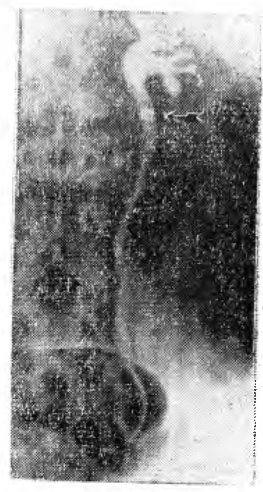 Хромоцистоскопия 19/111-52 г. Емкость и слизистая оболочка мочевого пузыря нормальны. Устья мочеточника без патологии. Индигокармин, введенный внутримышечно, справа стал выделяться через 6 мин. Из устья левого мочеточника выделения индигокармина за 12 мин наблюдения не отмечалось. Произведены катетеризация левого мочеточника и ретроградная пиело-уретерография в двух проекциях. Почечная лоханка и чашечки несколько расширены. На фоне заполненного контрастным веществом расширенного начального отдела левого мочеточника видна интенсивная (металл!) тень 1X1 см с зубчатыми очертаниями (рис. 1).