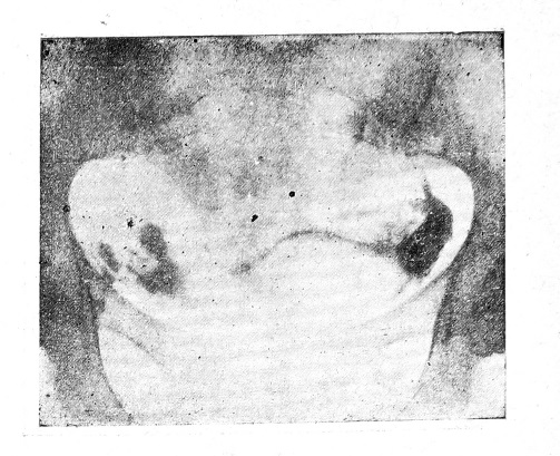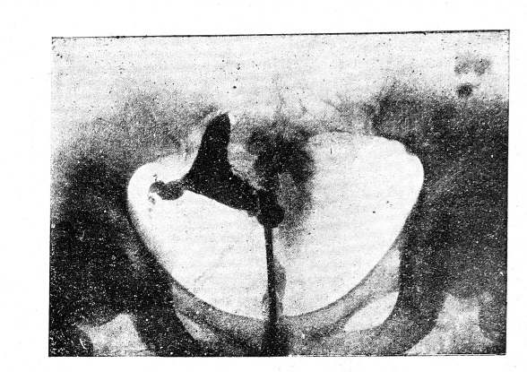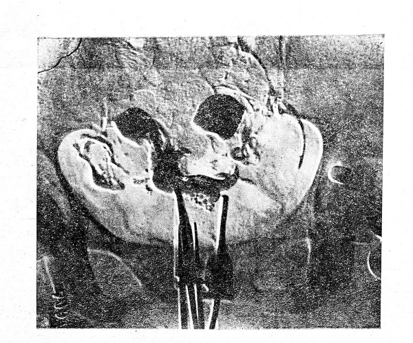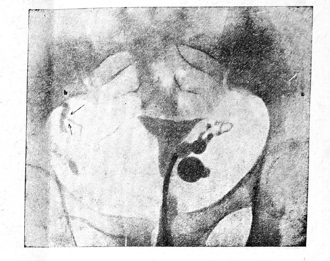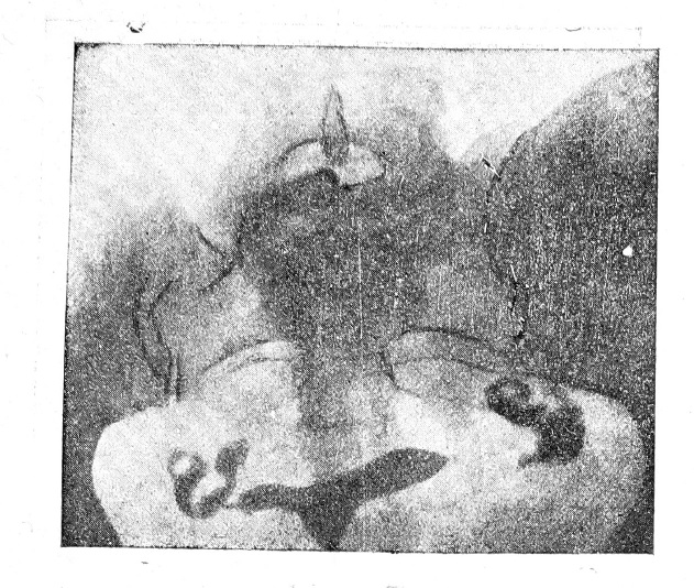 В ряде наших случаев мы сделали дополнительные позитивы в виде рент- генобарельефов (рис. №№ 7, 8 и 9) по методу Вé1а-А1ехandег’а (1910 г.), для подчеркивания пластическим изображением исследуемых, иногда важных, де талей на снимке. Сущность этого способа заключается в следующем. С негатива- пленки делается на пленке же позитив. Затем негатив и позитив прикладываются плотно друг к другу так, чтобы контуры изображения на негативе точно совпадали с контурами изображения на негативе (см. на свет!), после чего позитив слегка сдвигается в сторону и, таким образом, получается негативное изображение барельефа. В этом положении углы пленок—негатива и позитива—скрепляются и с полученного таким путем негатива производится отпечаток, дающий рентгенобарельеф.