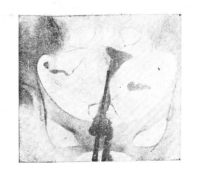 Наконец, среди нашего материала мы выявили также случаи редкой аномалии—полное разделение полости влагалища с наличием двух совершенно самостоятельных маток (рис. № 7). В каждое влагалище вдавалась самостоятельная portio vaginalis конической формы с хорошо проходимыми цервикальными каналами. Мы предварительно ввели катетер в цервикальный канал, находящийся в левом влагалище, и заполнили полость матки ок. 6 куб. см. иодипина, причем на снимке выявили сильно отклоненную влево полость, имеющую необычную грушевидную -форму. Из противоположной цервикальному отделу части матки отходила извивающаяся тонкая тень одной фаллопиевой трубы. В брюшной полости определялись шарики иодипина, следовательно труба оказалась проходимой. Затем, мы, не вынимая катетера из левого цервикального канала, вставили второй катетер в правый цервикальный канал и ввели вновь 6 куб. см. иодипина, после чего сделали второй снимок. На рентгенограмме мы определили сильно отклоненную вправо совершенно самостоятельную вторую матку—также с полостью грушевидной формы. Из аналогичного первой матке места отходила сильно извитая одна фаллопиева труба. В брюшную полость вновь проникло много иодипина в виде шариков частично, в виде расползшейся массы; таким образом, и правая труба оказалась проходимой. О толщине влагалищной перегородки можно судить по тени пинцета, захватившего эту перегородку по длине ее (рис. № 7).