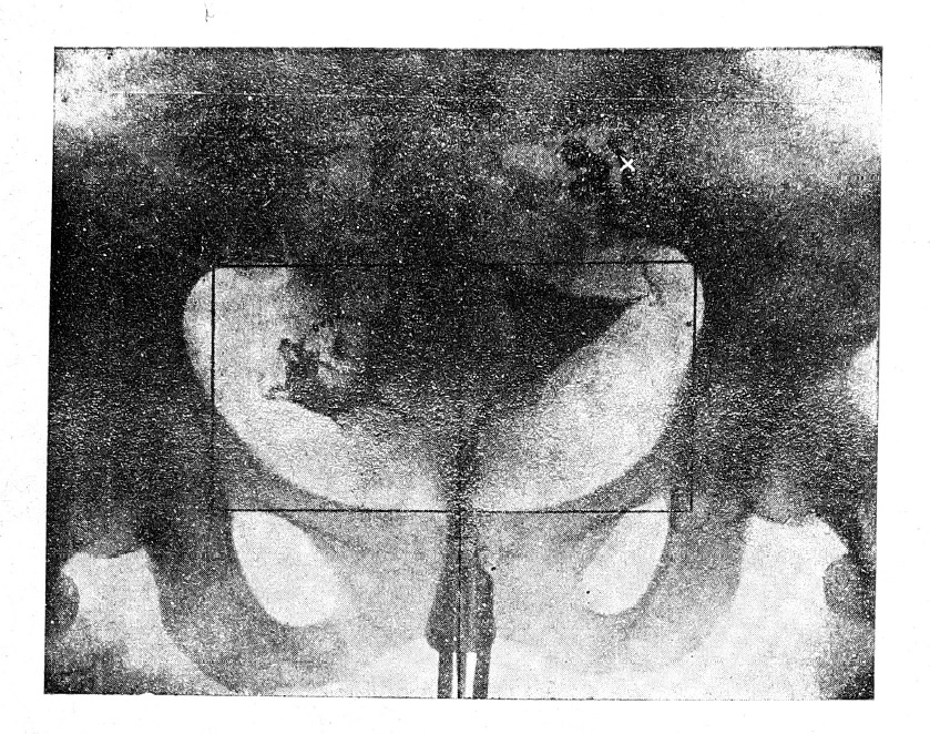 Катетер после соответствующего изгиба вводился во внутренний зев с таким расчетом, чтобы конец его не достигал 1—1½ см. до дна полости матки, предупреждая тем самым травматизацию и возможные сокращения ее 3). Затем вынимались зеркала и больная—с вытянутыми ногами—осторожно продвигалась для снимка к головному концу стола-на диафрагму Bucky-Potteг’а с таким расчетом, чтобы центральный луч проходил через середину между симфизом и пупком - по средней линии. Часть наших снимков производилась нами (в поли клинике Заречья) без диафрагмы Buck у-Ро11ег’а; в этих случаях больная продвигалась и укладывалась на кассету (раз. 24X30) с таким же расчетом по отношению к центральному лучу.