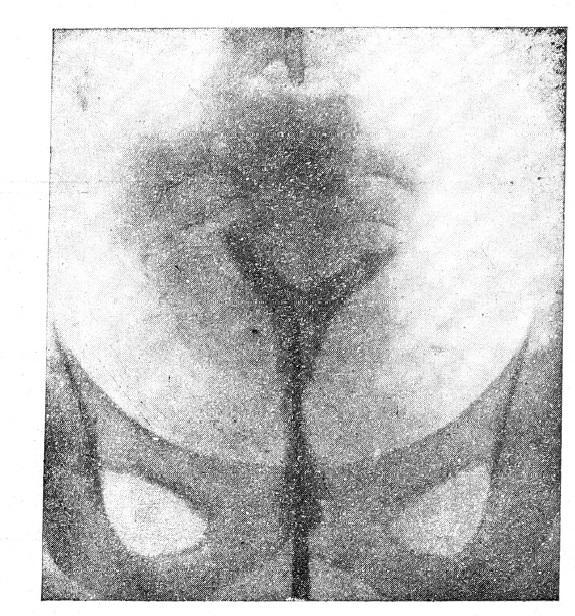 В части случаев мы получили изображение труб полностью до абдоминального конца с тенью фимбрий, но без обнаружения иодипина в брюшной полости; это указывало на зарощение труб в абдоминальном конце; в некоторых случаях определялось значительное расширение (компенсаторное) прилежащего отдела труб (рис. №№ 9 и 9а). При одно сторонней проходимости—на соответствующей проходимой трубе стороне—определялись в брюшной полости тени шариков иодипина (рис. № 10). При наличии спаек в брюшной полости контрастное масло иногда собиралось между спайками и контурировалось с резко очерченными границами (рент. № 7108).