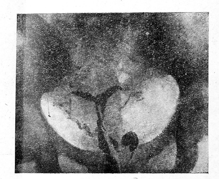 Введение контрастного вещества производилось нами очень медленно, равномерно (без рывков!) и при минимальном давлении на поршень. В среднем, эта процедура занимала от 3 до 5 минут и—в части случаев контролировалась в освещенном кабинете на трохоскопе—помощью криптоскопа. Во всех случаях давление при наливке безошибочно контролировалось тактильным ощущением. В зависимости от величины полости матки вводилось от 3—5 до 8—10 куб. сант. йодистого масла. В тех случаях, когда больная жаловалась на появившуюся хотя бы и незначительную болезненность в области живота или крестца, мы считали введенное количество контрастного вещества достаточным-и производили снимок. Рентгеновские снимки нами производились на пленках размером 24X30 см. с двумя усилив, экранами. В некоторой части наших случаев мы производили контрольные снимки на пластинках того же размера с одним усилив, экраном. Снимки нами производились на аппарате „Diax“, трубкой „Media“ без тубуса; расстояние от антикатода—в среднем 55—60 см.; экспозиция при 55—60 КѴ и 20 mA на пленках с двумя усилив, экранами и с диафрагмой Виску-Ро11ег’а—15 секунд; без диафрагмы Виску-Ро11ег’а—4-5 сек. (смотря по конституции больной). На пластинках—при тех же условиях—экспозиция соответственно удлинялась— с диафрагмой В.-P.— до 60 сек.; без диафрагмы—до 10—12 сек.