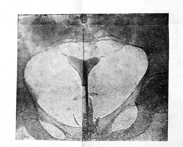 - Больная П. 44 лет, обратилась в гинекологический кабинет поликлиники Заречья по поводу опухоли в области живота, которую она заметила впервые- лет 6 тому назад; тогда опухоль, по ее словам, была величиной с куриное яйцо.. С тех пор она медленно, но прогрессивно росла; болей не причиняла. Менструации у б-ой были по 3 дня через 3 недели и сопровождались резкими болями в пояснице. При бимануальном исследовании была определена большая, величиной с голову новорожденного, выстоящая из полости малого таза матка, на перед ней поверхности которой прощупывались узлы опухоли плотной консистенции, безболезненные. Предположительный клинический диагноз-fibromyoma uteri intra murale. Для окончательного и точного выявления характера опухоли и локализации ее была произведена в рентгенологическом отделении Ин-та метросальпингография. На рентгенограмме (рис. № 11) мы выявили резко сдвинутую вправо матку с почти горизонтальным направлением продольной оси ее; увлеченные размеры полости матки. Контур полости слева вдавлен. Левая труба непроходима в pars isthmica; правая заращена в pars interstitialis. На 2-х контрольных снимках те же данные. Сопоставив рентгенограммы с клинической картиной мы диагностировали большую интерстициальную фибромиому матки. Своей массой опухоль резко сдвинула матку в правую сторону; небольшая вогнутость в просвет полости матки указывала на субмукозный рост этой опухоли. Б-ная была оперирована. Диагноз на операции подтвердился.