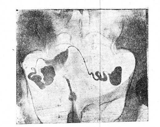 На наших рентгенограммах мы имели возможность выявить довольно ясную картину перистальтики труб. Особенно убеждают нас в этом сделанные нами серийные снимки. На рис. № 9 мы видим ровный контур проксимального отдела правой фаллопиевой трубы и волнообразно извитой контур дистального конца ее; аналогичные контуры мы определяем и в левой трубе. На контрольной рентгенограмме (рис. № 9), сделанной через 12 минут, мы видим уже изменение кон туров обоих труб: начальный отдел левой трубы принял слегка извитой характер, а периферические отделы обоих труб резко изменили характер «волн»; на отдельном участке обоих труб впереди расширенного абдоминального конца мы определяем резкое сужение просвета их—слева в виде узкого перехвата, справа в виде сужения на некотором протяжении. На рис. № 3 мы определяем по ходу- левой трубы чётко подобные расширения просвета ее, а справа ясно видим и двойные контуры трубы. Все это убеждает нас в том, что трубы обладают способностью производить движения волнообразного характера, характера колебательного (параллельные контуры!) и перистальтического.