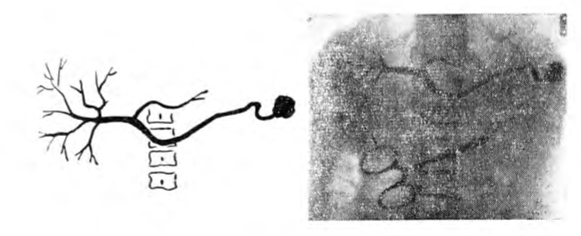 Такие изменения со стороны селезеночной вены наблюдались в 13 случаях. Только в двух наблюдениях, когда выявлены весьма небольшие вдавления по верхнему контуру селезеночной вены, больные подверглись резекции желудка с удалением единичных забрюшинных метастазов. Таким образом, хотя обнаружение подобных небольших изменений V. lienalis не всегда является доказательством иноперабельности, они заслуживают внимания.