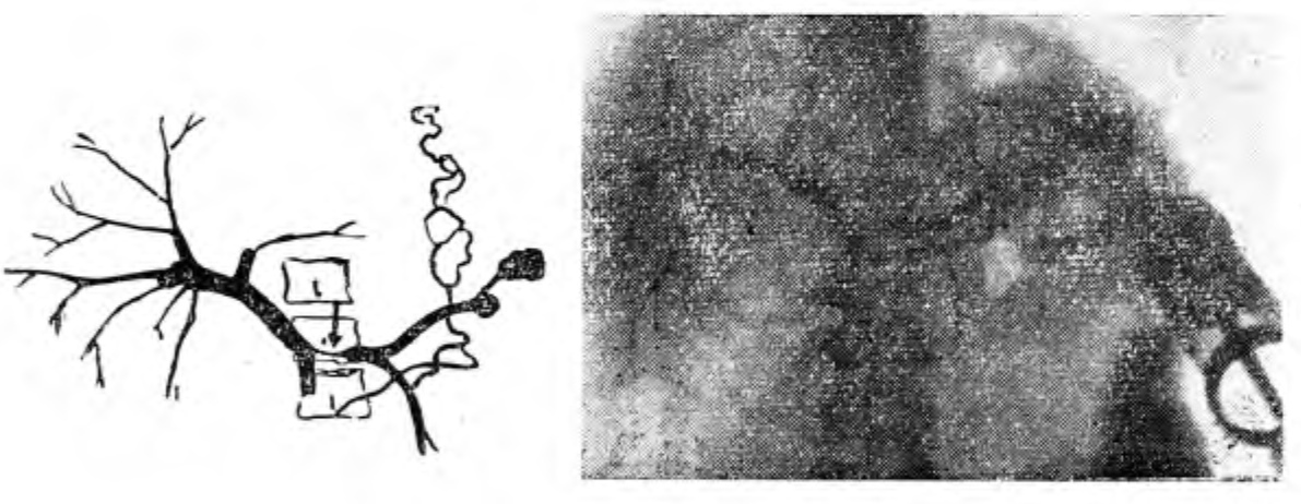 Приводим пример. К-, 50 лет, поступил 13/1-60 г. с диагнозом «рак антрального отдела и тела желудка». 23/1 — спленопортография: селезеночная, воротная вены и внутрипеченочные разветвления с четкими контурами, без видимых изменений (рис. 1). На 7-й секунде получена нормальная гепатограмма (фаза капиллярного гомогенного контрастирования печени).