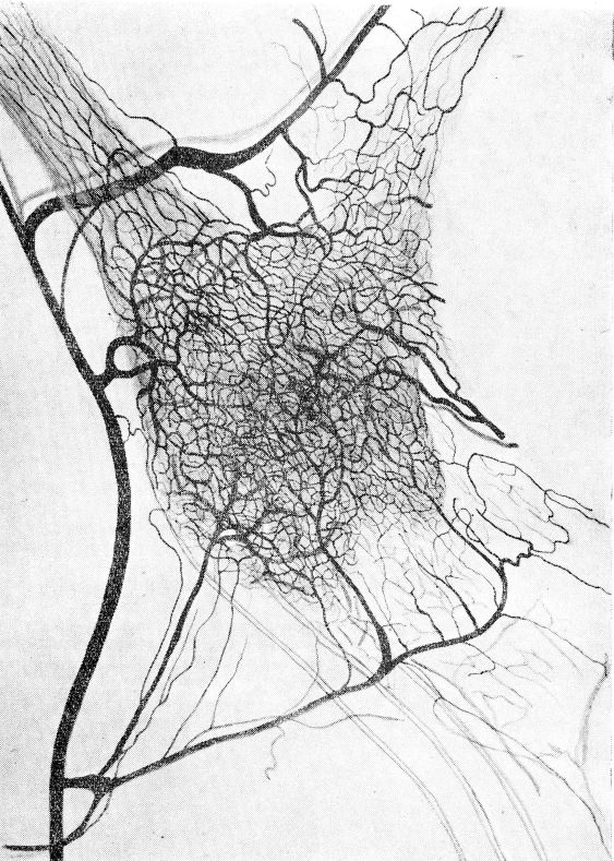 При изучении срезов превертебральных ганглиев, а также целых просветленных узлов нами были обнаружены участки, резко отличающиеся густотой капиллярной сети и характером клеточных элементов от ткани самого узла. Эти участки, по морфологическим данным, аналогичны обнаруженным М. Т. Ракеевой (1955) в узлах пограничного ствола. По характеру сосудистой сети и клеточных элементов мы отнесли их к хромаффинным включениям, к параганглиям. Вопрос о кровоснабжении хромаффинных включений в симпатических узлах освещен в литературе недостаточно несмотря на большую физиологическую важность, связанную с решением проблем, о путях поступления в организм и месте приложения действия инкрета хроомаффинной ткани. Мы внесли в план нашего исследования и этот вопрос.
