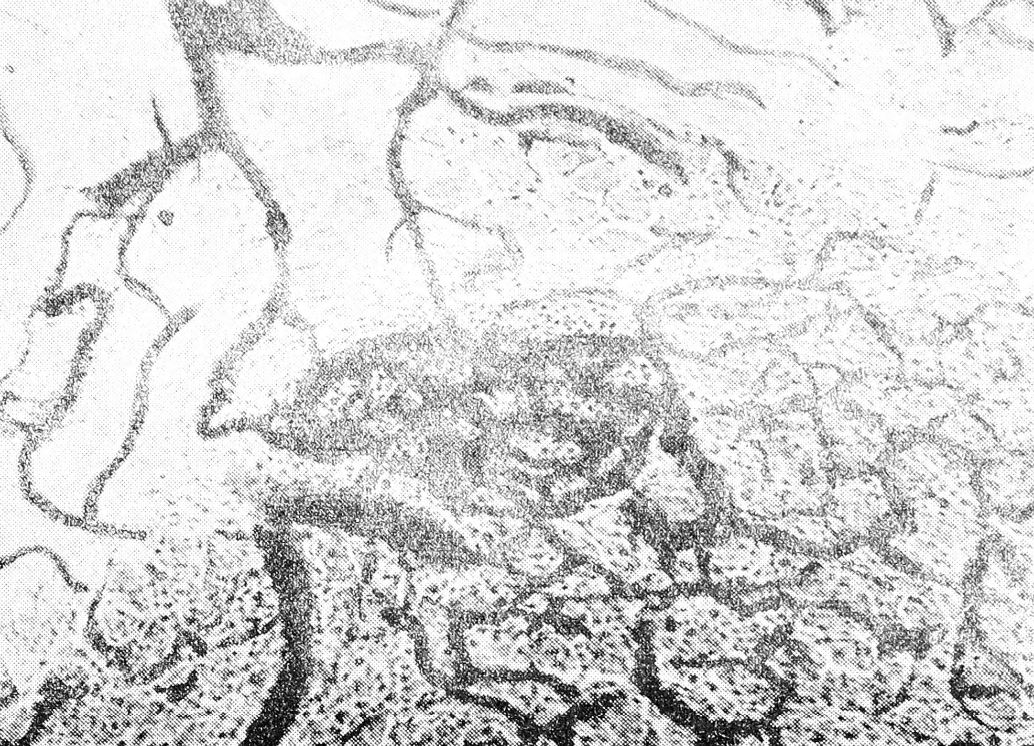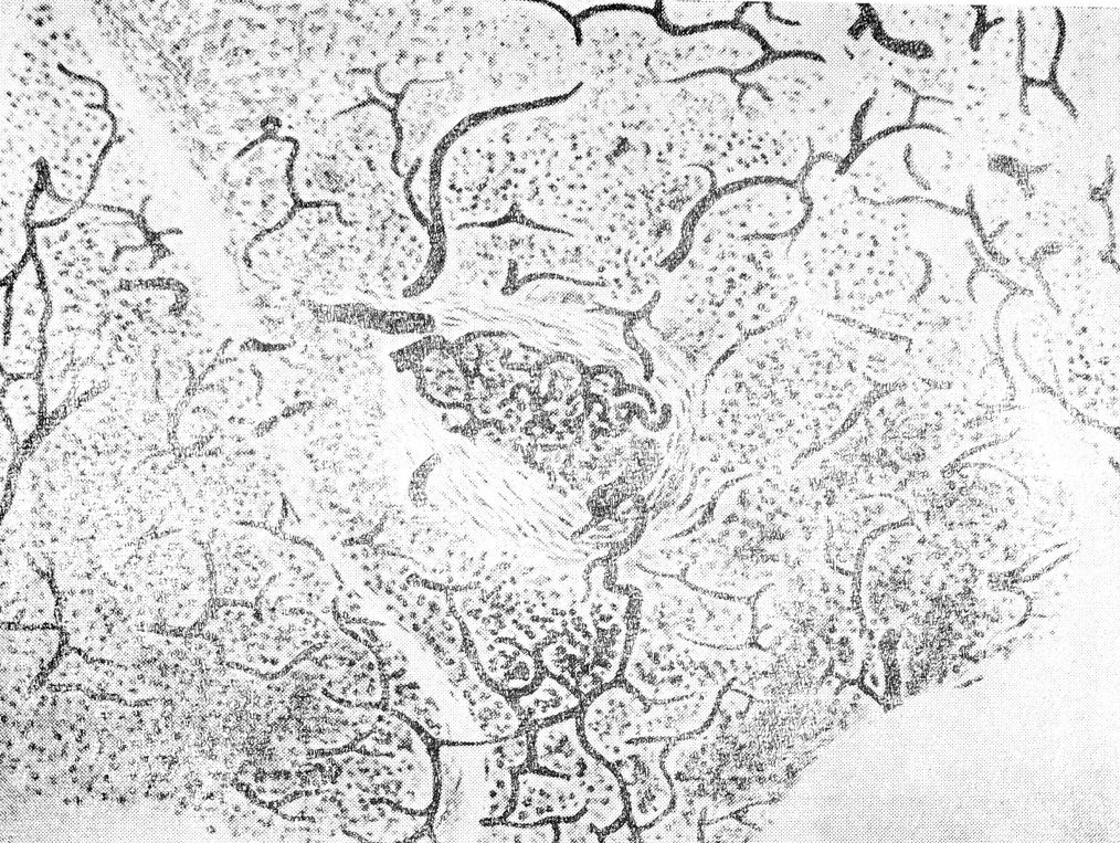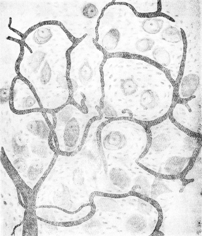 При просмотре просветленных препаратов полулунных узлов солнечного сплетения, верхнего и нижнего брыжеечных ганглиев, как у плодов человека, так и у некоторых животных (кошки, собаки), нами обнаружены на вентральной поверхности узлов сосудистые участки с исключительно мелкопетлистой капиллярной сетью, округлой или вытянутой формы, размером от 92×52 μ до 172×52 μ, резко отличающиеся от общего характера ветвления сосудистой сети узла (рис. 4). В петлях этой капиллярной сети тяжами располагается большое количество мелких клеток округлой формы, тесно прилегающих друг к другу. Окраска таких препаратов хромовой кислотой и ее солями, по методу Хилларпа и Хокфельта, дала положительные результаты. Приносящие сосуды, возникающие из ветвей артерий ганглия, вступают в такой участок обычно со стороны его верхнего (краниального) полюса. У нижнего (каудального) полюса параганглия формируются выносящие вены, притоки которых лежат на его поверхности. Вены, отводящие кровь из параганглия, извиваясь, впадают в отводящую венозную сеть ганглия или окружающей клетчатки. При изучении гистологических препаратов участки хромаффинной ткани обнаружены как в веществе самих узлов, так и в соседстве с ними, а также в отходящих от них нервных стволах. Иногда скопления хромаффинных клеток в превертебральных узлах отделены от ткани узла ясно выраженной соединительнотканной капсулой.