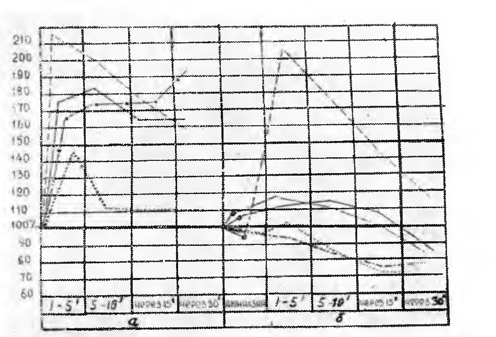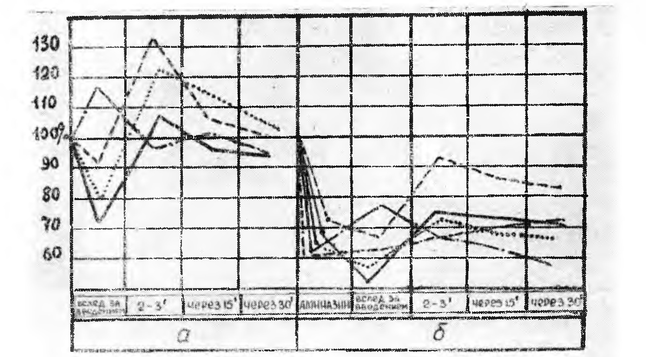Рис 1. Вентиляционный объем легких у кроликов под влиянием аналептиков на фоне морфина (al и морфина с аминазином (б). По вертикали указан объем выдыхаемого воздуха в процентах, по горизонтали — время опыта. Обозначения:— лобелии кофеин. --------------циперин,------- коразол,--------------аминазин.