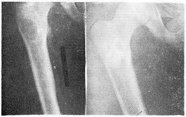 3., 15 лет, поступил в отделение 10/I 1979 г. по поводу костной кисты проксимального отдела правой бедренной кости. 24/1 под кратковременным общим обезболиванием в полость двумя иглами введено 15 мл костного микста с предварительным промыванием полости физиологическим раствором и последующим заклиниванием отверстий заостренными ксенотрансплантатами. Наложена легкая задняя гипсовая лонгета. В течение 5 дней у больного держалась субфебрильная температура. Выписан на 16-й день без гипсовой фиксации. Через 6 мес рентгенограмма показала полное замещение полости остеоидной тканью (рис. 3 и 4).