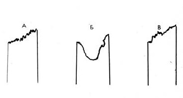 Рис. 4. Копии фотограмм: А—здоровый симметричный участок; Б — патологический участок до введения костного микста; В — через 6 мес после его введения.