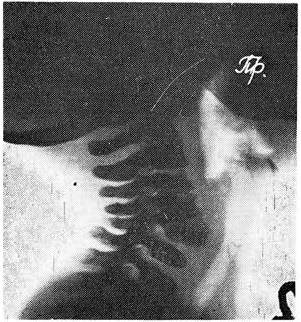 Для дальнейшего улучшения и уточнения диагностики родовых повреждений позвоночника и спинного мозга необходима разработка рентгеноконтрастных методов исследования, в первую очередь системы позвоночных артерий в сопоставлении с морфологическими и клиническими данными. Значительные возможности в диагностике родовой травмы спинного мозга у новорожденных имеет миелография.В связи с этим возникает новая, очень интересная и сложная проблема, связанная с повреждениями позвоночных артерий, которые проходят в узком костном канале поперечных отростков шейных позвонков. Даже их незначительное травмирование может нарушить вертебральный кровоток. Позвоночные артерии кровоснабжают ствол мозга, его затылочные доли, мозжечок, шейный отдел спинного мозга. В стенке позвоночных артерий имеется своеобразный вертебральный гломус, идентичный каротидному синусу. Уже при небольшом раздражении этого гломуса возникает спазм позвоночных артерий ее всеми вытекающими отсюда последствиями, не говоря уже о сдавлении артерий смещенными позвонками, геморрагиями в канал. Расстройство кровообращения в зоне васкуляризации позвоночных артерий может привести к появлению параличей и даже смерти вследствие нарушения кровоснабжения ствола мозга. Известно, что в родах наибольшая нагрузка приходится на шейный отдел позвоночника плода. Так, у 86,5% с клиническими симптомами родовой травмы спинного мозга позвоночник и спинной мозг повреждаются на уровне шейного отдела, поэтому выявление рентгенологических симптомов родовой травмы особенно важно именно на цервикальном уровне (рис. 1).