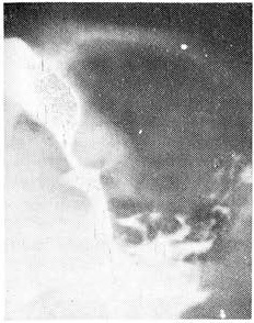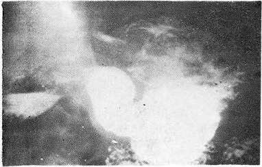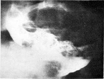 Рис. 3. Рентгенограмма больного Е., 24 лет. На фоне газового пузыря желудка определяется тень опухоли. Абдоминальный сегмент пищевода на протяжении около 1 см неравномерно сужен.