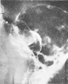 Рис. 2. Боковая рентгенограмма желудка того же больного. На задней стенке надкардиального, кардиального и подкардиального отделов — бугристая опухоль, переходящая на абдоминальный сегмент пищевода.