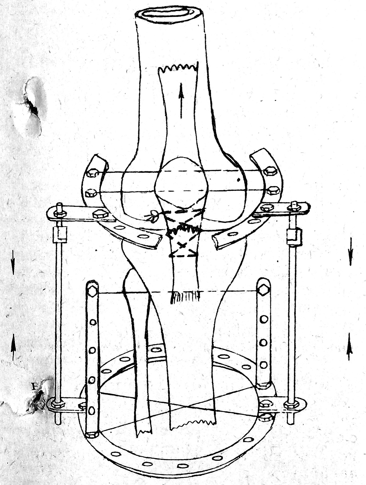 В отделении травматологии Казанского филиала ВКНЦ «ВТО» разработан и с 1988 г. успешно применяется способ лечения повреждений собственной связки надколенника с помощью аппарата Илизарова. Операцию проводят в два этапа под наркозом, перидуральной или проводниковой анестезией. На первом этапе накладывают и монтируют двухсекционный аппарат Илизарова, состоящий из кольцевой опоры в верхней трети большеберцовой кости и полукольца на надколеннике. С этой целью через верхнюю треть большеберцовой кости проводят две перекрещивающиеся спицы и укрепляют в кольце аппарата. Через надколенник пропускают две параллельные спицы во фронтальной плоскости, которые укрепляют в полукольце так, чтобы не было движений его вокруг фронтальной оси. Опоры соединяют резьбовыми стержнями и по ним производят низведение надколенника, сближая тем самым концы поврежденной собственной связки. Степень низведения определяется клинически и рентгенологически, при этом нижний полюс надколенника устанавливают на уровне щели коленного сустава. При приведении надколенника происходит натяжение прямой мышцы бедра, устраняется ретракция ее волокон, сама мышца поддерживается в состоянии физиологического тонуса. Движения в коленном суставе сохранены, нагрузка по оси конечности возможна полная. Больной ходит с первого дня после операции.