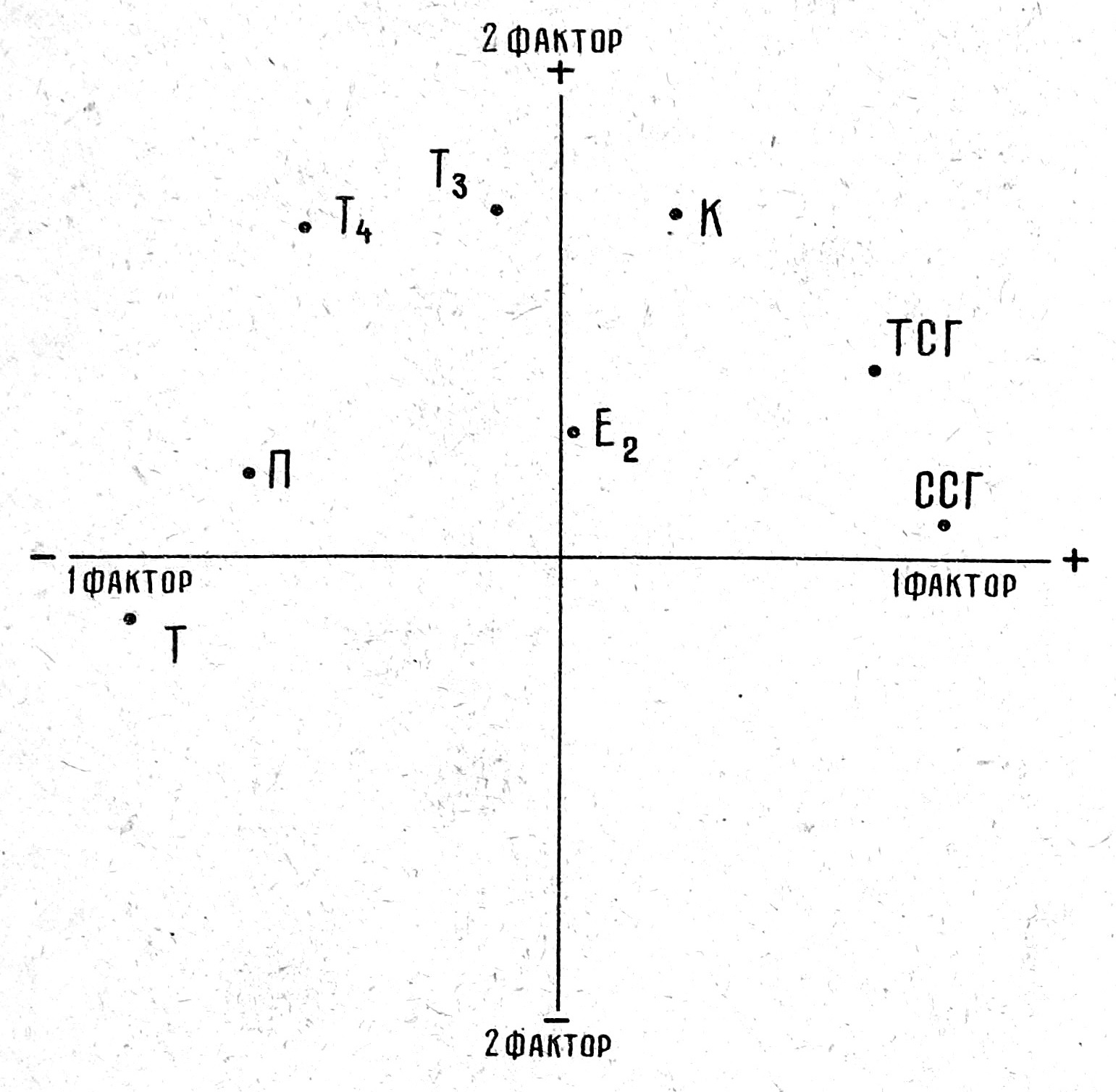 Обработка полученных данных на ЭВМ Q-методом факторного анализа подтвердила вывод об отсутствии существенного различия в характере взаимоотношений ССГ ТСГ со стероидными и тиреоидными гормонами у больных до операции и после нее (рис. 1.). Для проведения сравнительного анализа состояния эндокринной системы у женщин с нормопонирующим менструальным циклом (НМЦ) и больных с СПЯ с целью выявления у последних признаков нарушения корреляции ССГ ТСГ стероидных и тиреоидных гормонов данные о их содержании в плазме крови были обработаны на ЭВМ R-методом фактрного анализа (рис. 2). Суммарный вес первых трех факторов превышал 50% в том числе вес фактора I составлял 25,8%, II - 20,2% и III - 15,4%. В факторе I с наибольшей нагрузкой участвовали такие компоненты, как ССГ, ТСГ, Т и П, с наименьшей — Е2, в факторе II с наибольшей нагрузкой — Т3, Т4, с наименьшей —ССГ, в факторе III с наибольшей нагрузкой—Е2, К, с наименьшей— Т.