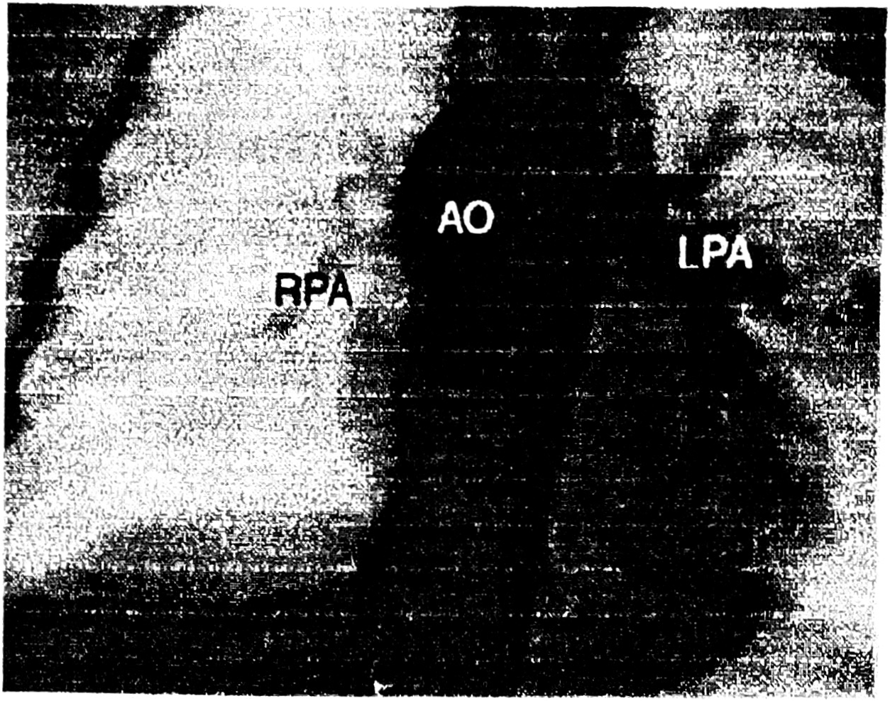 Рис. 1. Ангиокардиограмма больного Е., выполненная из проксимальной части аорты. Обозначения: АО — восходящая аорта, LPA — левая ветвь легочной артерии, RPA — правая ветвь легочной артерии.