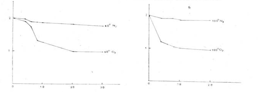 Рис. 3. Динамика тепловой инактивации тканевого тромбопластина в атмосферном воздухе и азоте. По оси ординат — активность тромбопластина в lg-шкале; по оси абсцисс — время в мин. А — температура инактивации 60°, Б — температура инактивации 100°.