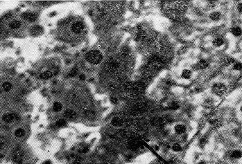 Гистоструктура печени больной А., 50 лет. Стрелкой указаны гиперплазированные М-клетки печени. Окраска гематоксилин-эзоином. X500.