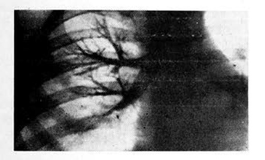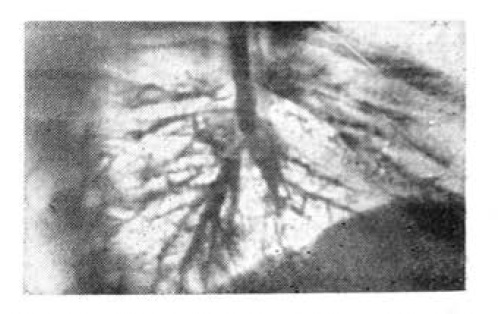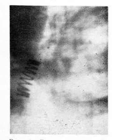 Зимой 1979 г. при профосмотре в школе никакой патологии не выявлено. В сентябре 1979 г. при флюорографическом обследовании школьников у мальчика было обнаружено инородное тело в проекции правого главного бронха (рис. 1), что послужило поводом для его направления в наше отделение.