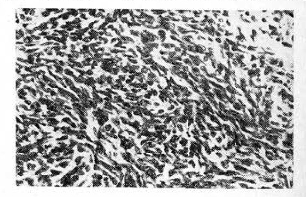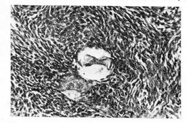 При изучении женских гонад привлекает внимание резкое обеднение фолликулярного апланата. Примордиальные фолликулы у больных в возрасте 30—39 лет отмечены в 12 наблюдениях из 20, в возрасте 40—49 лет — в 6 из 58. Во всех случаях примордиальные фолликулы были единичными и имели признаки глубокой дегенерации (рис.1). Малые зреющие фолликулы в 1-й возрастной группе обнаружены у 4 женщин, во 2-й — у 2. Большие зреющие фолликулы и граафовы пузырьки ни в одном случае нам не встретились.