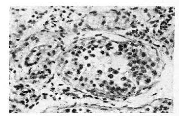 Выраженные изменения выявляются и в семенниках. Стенки семенных канальцев резко утолщаются вследствие усиления склеротических процессов, сопровождающихся выраженным угнетением сперматогенеза (рис 3). У онкологических больных уже в возрасте 30—39 лет в просветах семенных канальцев наблюдаются уменьшение, а часто и полное исчезновение сперматид и сперматозоидов, что, по-видимому, можно объяснить задержкой дальнейшей дифференцировки сперматоцитов. Наряду с этим, особенно при прогрессировании опухоли, происходит угнетение и сравнительно ранних фаз сперматогенеза. В более поздних стадиях опухолевого роста в канальцах остаются лишь сперматогонии и поддерживающие клетки.