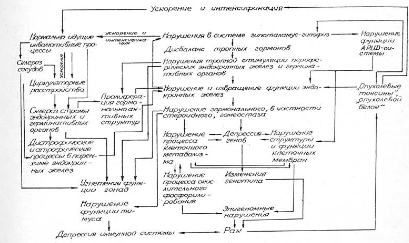Являясь вторичными и развиваясь на фоне обычной возрастной инволюции, эти изменения касаются прежде всего системы гипоталамус—гипофиз. Нарушения функции в системе гипоталамус—гипофиз ведут к изменениям тропной стимуляции периферических эндокринных желез, а склеротические процессы в микроциркуляторном русле и строме — к расстройству механизмов обратной связи в аппарате регулирования деятельности желез и к дезорганизации деятельности эндокринной системы в целом. Все это влечет за собой снижение и извращение функции желез и нарушение гормонального, в частности стероидного гомеостаза.