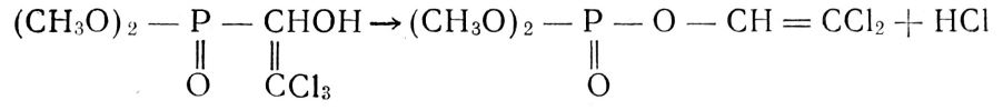 Избирательная активность хлорофоса по отношению к комнатным мухам объясняется повышенной способностью их, по сравнению с другими насекомыми, производить дегидрохлорирование хлорофоса, в результате чего токсичность его значительно возрастает:
