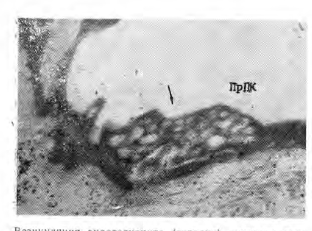 Везикуляция эндотелиоцита (стрелка) посткапилляра -щитовидной железы кота. Срок эксперимента — 20 суток. ПрПК — просвет посткапилляра. Х26 600.