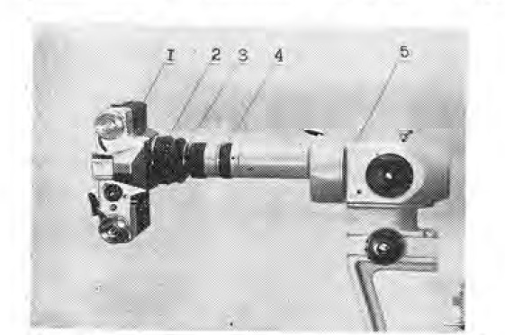 Рис. 1. Общий вид соединения окуляр-микрометра щелевой лампы с объективом фотоаппарата: 1 — фотокамера, 2 — объектив, 3 — переходное кольцо, 4 — окуляр-микрометр, 5— биомикроскоп.