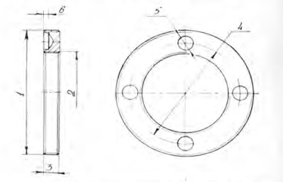 Рис. 2. Чертеж переходного кольца: 1— наружный диаметр с резьбой (М35,5Х0,5), 2— внутренний диаметр с резьбой (М.22,5X0,8), 3— толщина кольца (4), 4 — расстояние между точками для сверления выемок (29,5), 5 — диаметр выемки (4), 6 — глубина выемки (2).