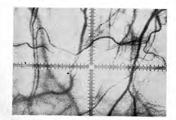 Рис. 3. Фото сосудов конъюнктивы глазного яблока с изображением крестообразно градуированной шкалы X 35.
