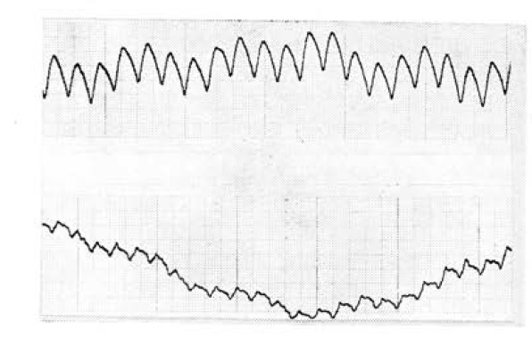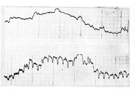 Рис. 2. Интраорганные пульсомоторограммы желудка больного Н. на 2 (сверху) и 3-й день после операции. Скорость движения бумаги—10 мм/с. Усиление — 10.