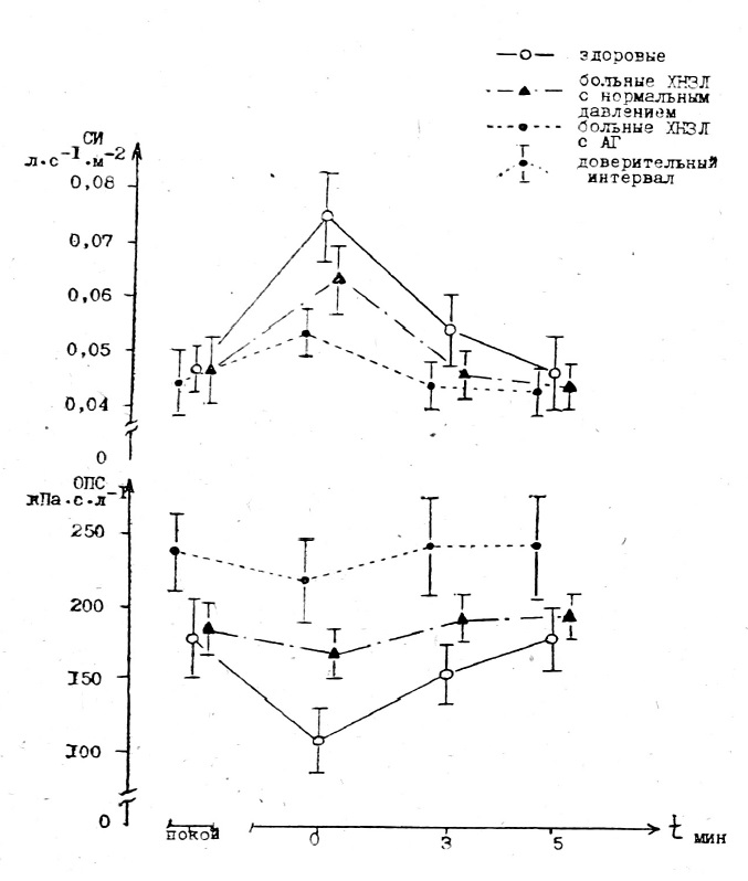 Физическая нагрузка вызывала однонаправленные изменения у всех обследованных, но степень этих изменений была также различной. У больных без артериальной гипертензии они были более выраженными и приближались к показателям здоровых людей. Прирост СИ, происходивший у всех больных преимущественно за счет ЧСС, был больше у нормотоников, чем у больных с пулмогенной гипертензией (см. рис.). У всех пациентов сразу после нагрузки ОПС снижалось, но через 3 мин восстановительного периода возвращалось к исходному значению. На всех этапах исследования ОПС у больных 1-й группы было достоверно выше, чем у пациентов с нормальным давлением. Следует отметить, что у больных 2-й группы по сравнению со здоровыми лицами ОПС изменялось незначительно.