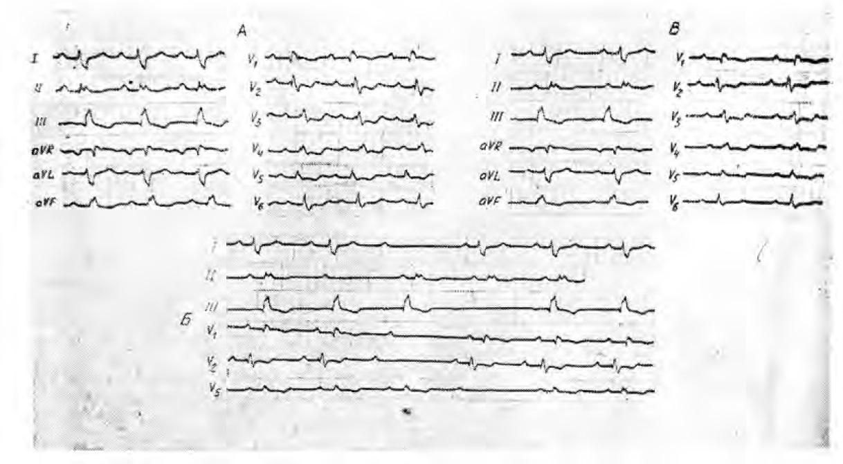 Постоянно фиксировались полная блокада правой ножки rsR1VI —0,13 с), дефнгурация и уширение второй половины QRS, соответствующие изменения ST—Т-и полная блокада задней ветви левой ножки (rS I, aVL', qRIII, aVF‘, <a=+11,2°). Предсердно-желудочковые нарушения проявлялись перемежающимися блокадами I и II степени. Замедление проведения достигало 0,24 с (рис. А, В), а блокада II степени выражалась периодами Самойлова—Венкебаха с динамикой интервала PQ от 0,18 до 0,25 с. (рис. Б).