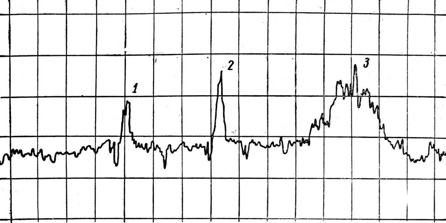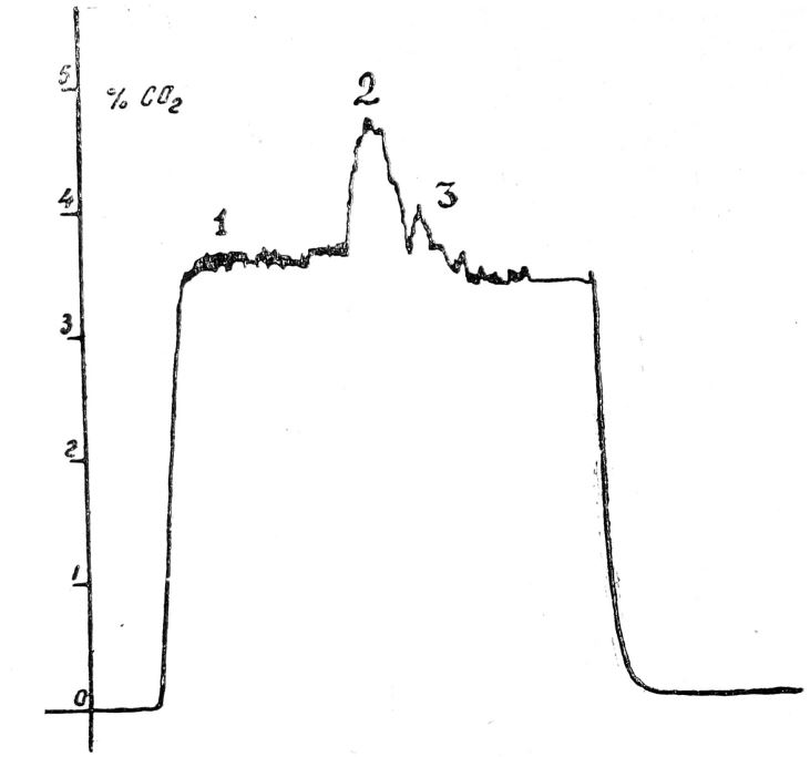 Рис. 4. Карбограмма здорового человека. По вертикали СО2 в процентах: 1) в покое, 2) при нагрузке, 3) возвращение к исходной величине