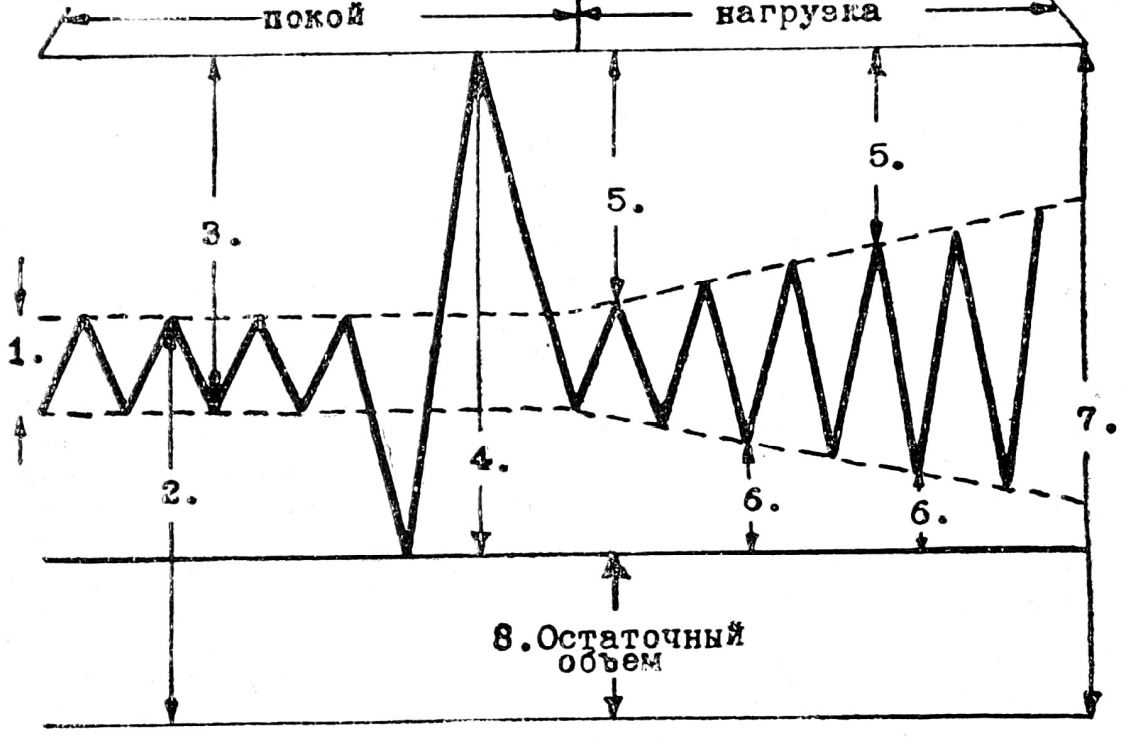 Рис. 2. Номенклатура легочных объемов по спирограмме, принятая Международной конвенцией 1950 г. 1. Дыхательный объем или экскурсирующий объем (автор). 2. Функциональный остаточный объем. 3. Инспираторная емкость. 4. Жизненная емкость легких 5. Инспираторный резервный объем 6. Экспираторный резервный объем. 7. Тотальная емкость легких. 8. Остаточный объем
