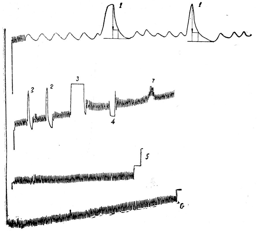 Рис. 3. Спирография на аппарате АООЗ-М: 1) проба Вотчала— Тиффно, 2) жизненная емкость, 3) проба с задержкой дыхания на вдохе, 4) проба с задержкой дыхания на выдохе, 5) выделение СО2, 6) поглощение кислорода, 7) МВЛ