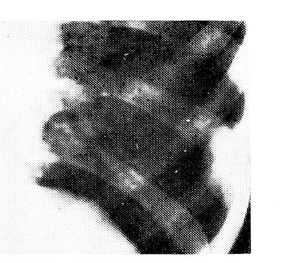 Рентгенологическая картина метастатического поражения ребер (62 больных) многообразна. Нами констатированы два варианта изменений. При первом из них ребро на некотором протяжении, обычно от 2-3 см и более, истончается, его контуры становятся нечеткими, структура ребра смазывается и наконец, замещается очагом деструкции. Такого же типа изменения выявлены нами у больных с лимфогранулематозным поражением ребер. При втором варианте поперечник ребра увеличивается, ребро незначительно вздувается, структура его приобретает крупноячеистый характер. При первом варианте изменений соответственно пораженному метастазом отделу пальпируется болезненное уплотнение, что облегчает пункционную биопсию, необходимую для установления достоверного диагноза, так как по рентгенологической картине деструкции ребер невозможно судить о характере процесса (рис.2)