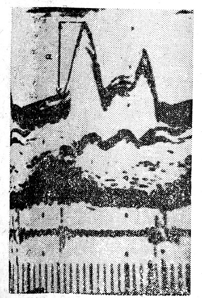 На эхокардиограмме больной С. была систолической части движения митрального роте датчика выявлялась ступенчатость того же систолического участка (рис. 4). На эхокардиограмме больной К.— раннее провисание створок на 3—4 мм в полость левого предсердия. Поскольку выраженные клинические данные отсутствовали, больным было назначено общеукрепляющее лечение, рекомендованы умеренные физические нагрузки.