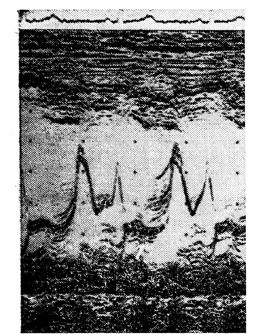 На ЭКГ отмечаются инверсия зубца Т, умеренная депрессия сегмента S — Т, различные нарушения ритма. Эхокардиографическое изображение митрального клапана в норме представляется в диастолу в виде М-образной кривой, а систолическая часть — в виде прямой, имеющей восходящее направление (рис. 1). При пролабировании митрального клапана изменяется только систолическая часть кривой, которая прогибается и не, имеет четкого смыкания. Фонокардиографический щелчок по времени совпадает с этим прогибом створок.