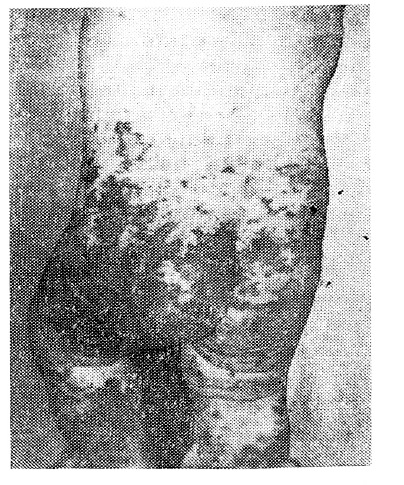 Повторная люмбальная пункция на 4-й день дала следующий результат: давление ликвора нормальное, цитоз — 80. Реакция Панди 4-1, белок-—0,4 мг/л. В последующем больной получал оксациллин по 0,1 г 4 раза в день внутрь в течение 10 сут. назначен гидрокортизон — 60 мг внутривенно в течение 2 дней и преднизолон по 15 мг 2 раза в день внутривенно в течение 6 дней. С целью патогенетической и дезиитоксикационной терапии использовали внутривенно 5—10% растворы глюкозы и натрия хлорида в равных дозах, 15% раствор маннитола, альбумин, протеин, гемодез, одногруппную плазму. Кроме того, больному были назначены лазикс, аскорбиновая кислота, кокарбоксилаза, коргликон. На фоне интенсивного комплексного лечения осуществлялась перевязка мазью Вишневского. В процессе терапии мочеиспускание нарушалось. На 3-й день болезни мелкие высыпания исчезли, оставив небольшую пигментацию; геморрагические участки стали стягиваться. Вся область ягодицы с уровня IV поясничного позвонка, области бедер и голеней представляла собой обширную раневую поверхность, покрытую некротическим струпом с фибринозно-гнойным налетом, который местами был сухим, с участком отторжения до мышечного слоя глубиной 1,5—2 см. Во время перевязок производили этапную некрэктомию ножницами, через 45 дней были удалены все некротические ткани, одновременно участки покрывались полноценными рубцами.